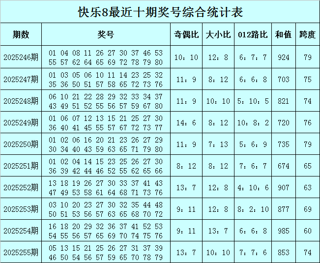 福彩欣忭8第2025255期开出奖号:05 13 15 21 25 26 27 31 37 39 46 50 54 56 57 59 65 70 78 79,其中奖号奇偶比开出13:7,大小比开出10:10,和值开出853,跨度开出74半岛综合体育信息,012路比开出7:7:6。