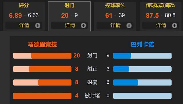 全场比赛,马竞的控球率为61%,一共有20次射门,其中8次射正;巴列卡诺一共有9次射门,其中3次射正。