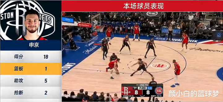 全场比赛申京30分钟,11中6,罚球10中7,拿到19分5助攻1篮板2抢断5特地,射中率54.5%,这是本赛季申京第二场1篮板,但第一场是因为他4分钟退场,申京吞下欺侮一战。