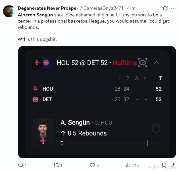火箭球迷:申京必须确保我方的篮板球卓越6个,否则外界齐会合计他在舞弊。