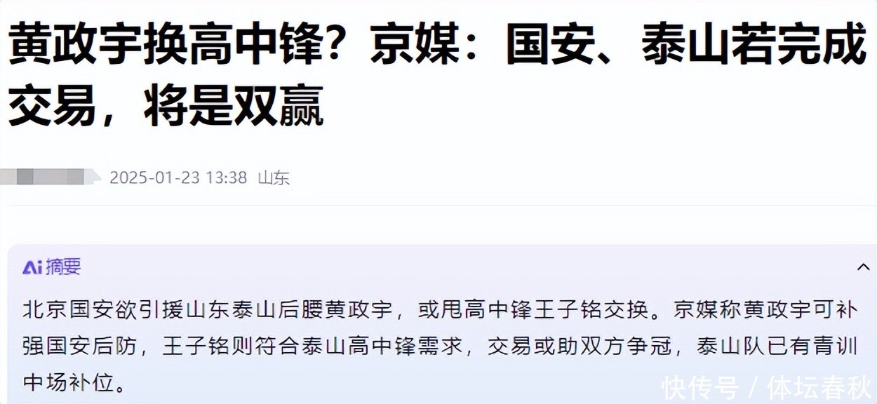 2025赛季的第一个中超转会窗行将开启体育集锦,近期坊间传出了不少中超各队的转会音讯,尤其是老牌劲旅北京国安和山东泰山。近日,一家山东足球媒体更是曝出了一个重磅音讯,国安和泰山有望进行国脚互换的交游。该媒体称,山东泰山或用国脚后腰黄政宇交换北京国安的国脚时尚王子铭。