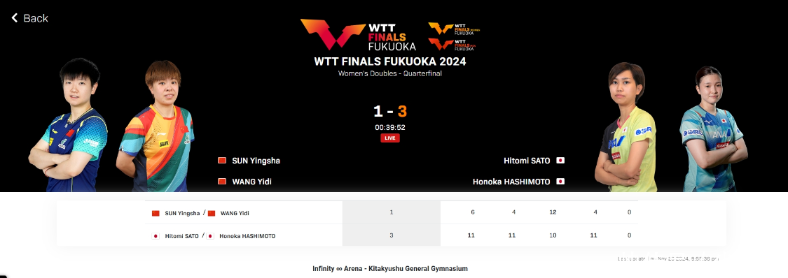 点击输入图片描摹(最多30字)第四场输外战则出当今女队,女队女双组合孙颖莎和王艺迪,相似也出现爆冷。在WTT福冈总决赛女双1/4决赛,寰宇名循序10的孙颖莎/王艺迪对阵寰宇名循序9的日本组合佐藤瞳/桥本帆乃香。最终孙颖莎/王艺迪1-3不气忿手,停步8强。四局比分别离为:6-11、4-11、12-10、4-11。与梁靖崑一样,孙颖莎和王艺迪的女双组合相似亦然一轮游。