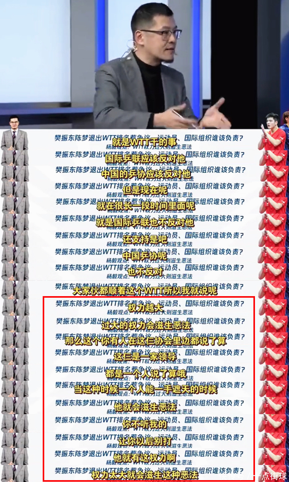 但是臆度连刘国梁都未始念念到的是,蓝本局限在WTT端正界限内的事件,跟着收罗的发酵,大众挖出了更多对于WTT赛事分辨理的场合,尤其是资金开始更是众说纷繁,随后闻明体育媒体东谈主杨毅在《有球必应》节目中,更是公开炮轰身兼三职的刘国梁,宣称过大的权力会孳生恶法,当三个协会都是一个东谈主说了算,那么这种技艺一手遮天就定会孳生恶法!言辞横暴让弥远网友都声歌颂,由于杨毅在体坛讲明圈的影响力,这件事情的柔软界限,仍是不局限在WTT端正那么苟简了