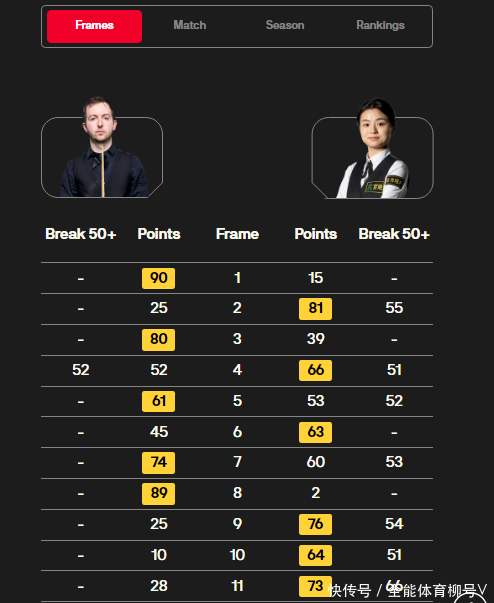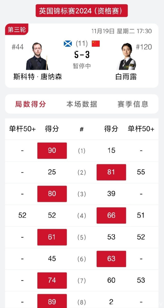 第七局,白雨露打出单杆56分,108-23拿下,4-3再次超越。第八局,琼斯回敬单杆68分,84-0零封白雨露,两边以4-4再次打平。